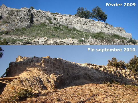 Les visuels ci-contre permettent d'illustrer cette intervention avec surtout l'aspect avant... puis après ce travail ! Quelques rangs de pierres sont venus s'ajouter aux éléments conservés mais qui menaçaient de se détériorer plus encore. La lecture et la compréhention du site se voient ainsi améliorés, car en effet, chaque visiteur ayant arpenté le château de Termes avait-il "vu" que là se trouvait une tour d'angle ? Pas sûr, car pas évident du tout jusque là ! Donc : merci aux intervenants !